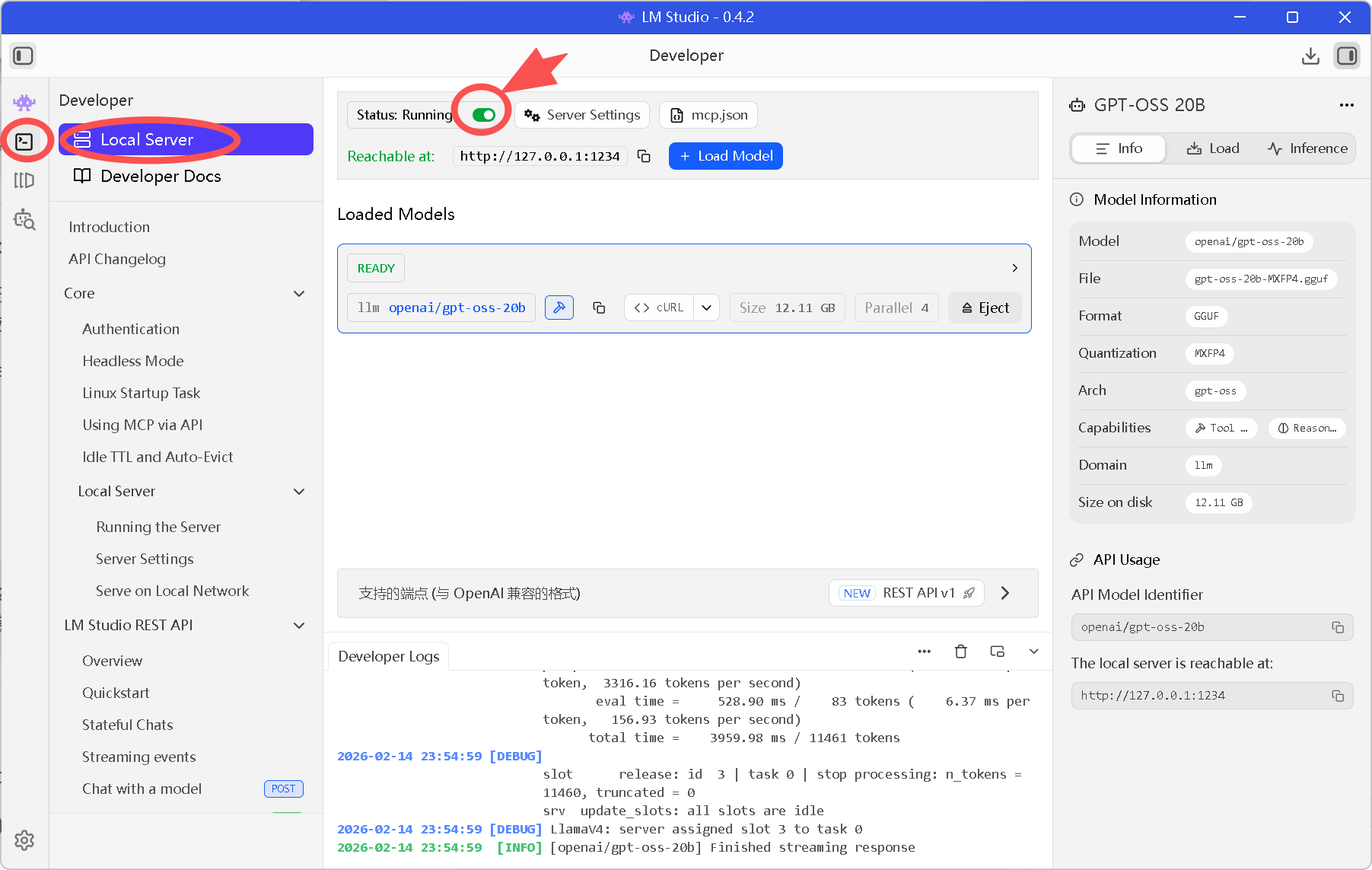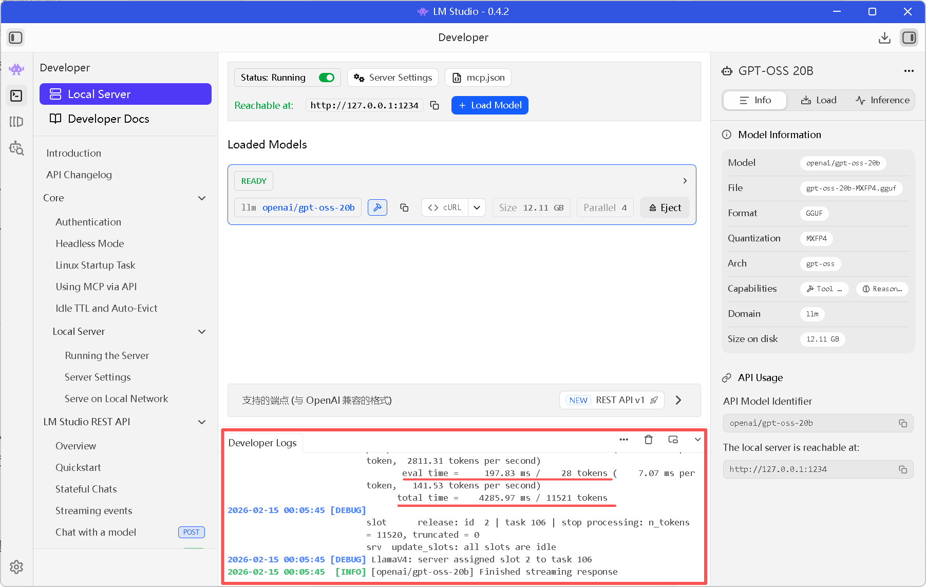 你可以在 LM Studio 的 Server Logs 窗口看到实时的请求日志。