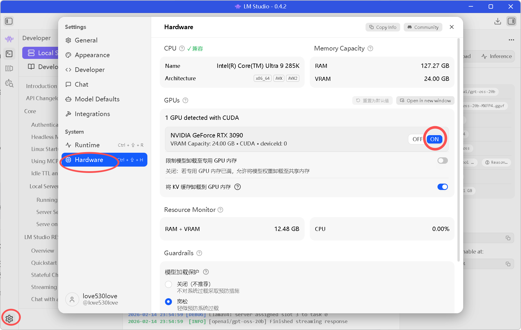 图4:LM Studio 成功识别 RTX 3090,显存容量 24GB,CUDA 加速已开启。