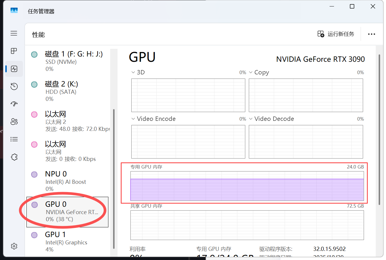 GPUs:确保识别并选中了你的 NVIDIA 显卡(如下方截图中的 RTX 3090)。