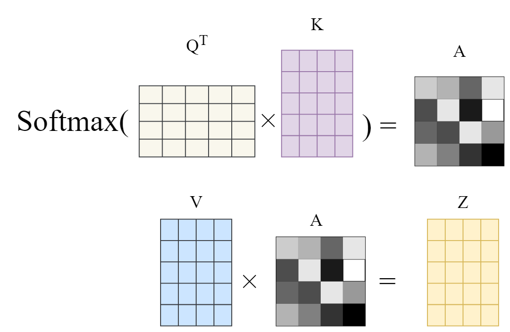 - Softmax(QK^T)V,计算加权的特征融合:如下图,特征矩阵 A 包含了词与词之间的注意力权重,和 V 相乘后,得到最终的 “搜索” 结果(通过加权求和的方式计算)。