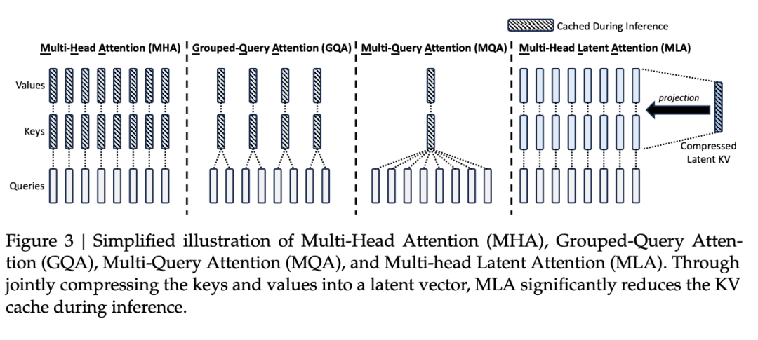 - MLA(Multi-Head Latent):DeepSeek 2024 年 5 月在 DeepSeek V2 中提出,并在 DeepSeek V3 中沿用。核心思路是每个 Head 都有独立的 K 和 V,但它们可以投影和反投影到同样的、共享的 Latent KV。KV Cache 和 MQA 相当,明显少于 MHA 和 GQA,但效果还不错,和 MHA 相当。但是也会额外的增加一些计算量。