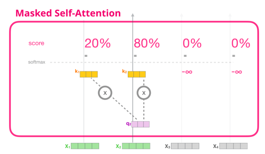 掩码(Mask)的作用是遮蔽一些特定位置的词。具体而言,掩码会被应用到点积的结果上,通常是将某些位置的值设置为一个非常大的负数(如负无穷),这样在应用 Softmax 时,这些位置的权重会接近于零,从而忽略对某些位置的学习。