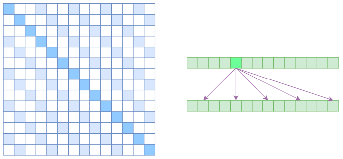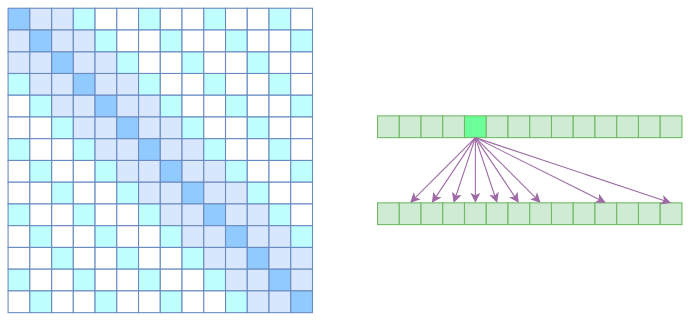 Sparse Self Attention(稀疏自注意力),将 Atrous Self Attention 和 Local Self Attention 合并为一个,除了相对距离不超过 k 的、相对距离为 k,2k,3k,… 的注意力都设为 0,这样一来 Attention 就具有了 “局部紧密相关和远程稀疏相关” 的特性。