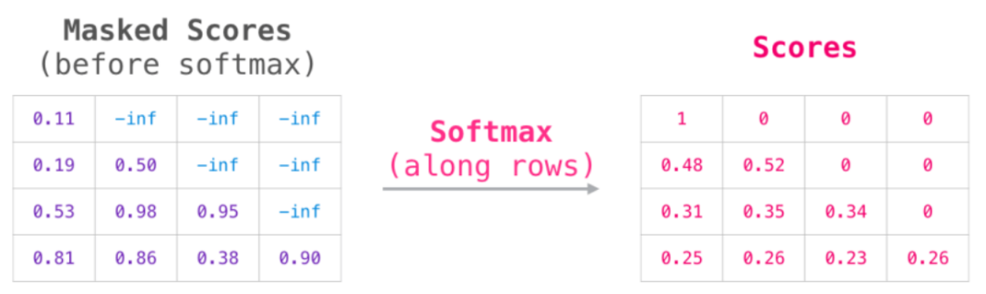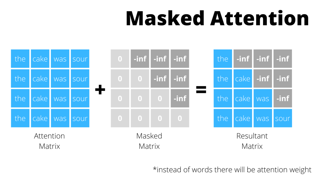 例如:待学习的文本序列是 the cake was sour,进行 Masked 处理之后,在每一行输入中,Decoder 仍然是只看到前面的词,并预测下一个词。