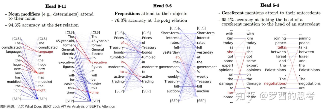 - 一个词和周围上下文的关注度也很大,因此多层运算中会慢慢出现 Localized Attention 的三角格式。