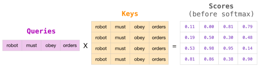 - QK^T,计算相似度:对 2 个文本序列的元素之间依次进行相似度计算,寻找出一个序列的每个元素对另一个序列的每个元素的相关度。