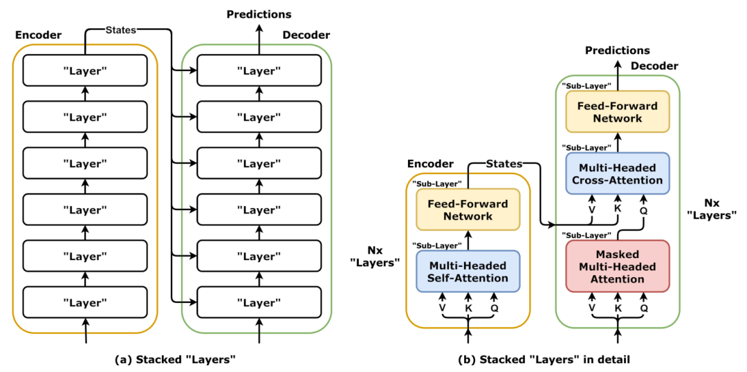 Transformer 由 Encoder 和 Decoder 组成,而 Encoder 和 Decoder 都会由多个相同的 Layer 堆叠而成。Input Sequence 进入 Encoder 进行编码,到 Encoder Layer 的最顶层再将编码结果(K、V)输出给 Decoder Layer 的每一层,通过 Decoder 解码后就可以得到 Output Sequence。