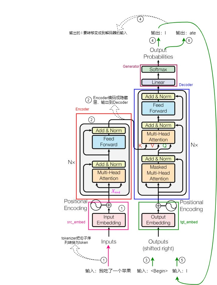 - 进入自回归,把生成的第一个单词 “I” 作为 Decoder 的输入(Outputs),再次进入 Decoder 解码生成出第二个单词 ate。
