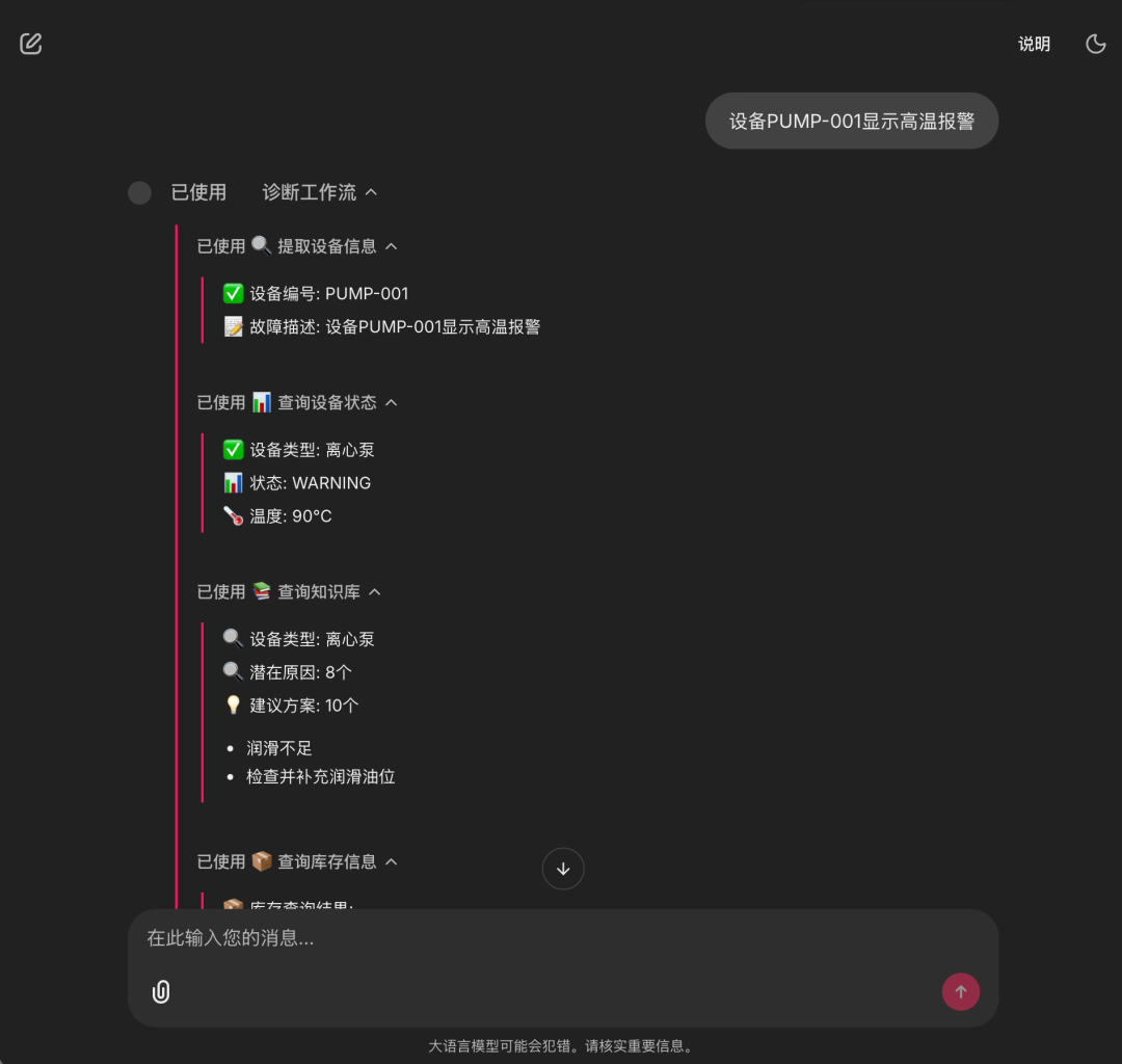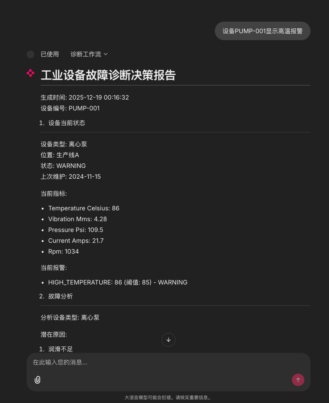 最终,系统返回包含设备状态、故障原因、历史分析、库存信息和行动建议的综合决策报告,为维修人员提供全面的决策支持。