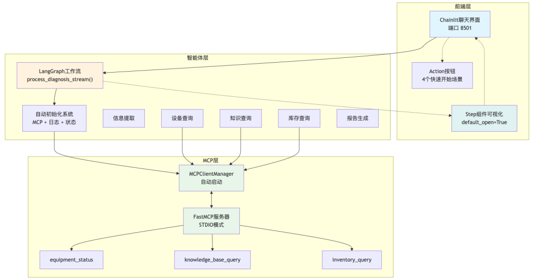 技术选型考量:项目选择这些技术的核心考量在于它们的互补性和对工业场景的适应性。LangGraph提供了灵活的工作流编排能力,MCP确保了工具调用的标准化,而Chainlit则提供了直观的用户界面,三者结合形成了一个完整的技术闭环。