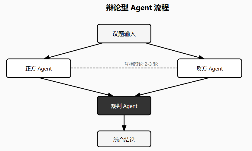 单个 Agent 容易陷入思维定式,一条路走到黑。辩论型架构引入多个持不同立场的 Agent,它们互相挑战对方的观点,在辩论中暴露漏洞、补充盲区。最后由一个中立的裁判 Agent 综合各方观点给出最终答案。