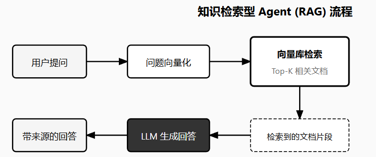 说几个落地场景。企业内部问答系统,员工问公司的年假政策是什么,Agent 从 HR 政策库里检索相关条款,组装成回答。产品帮助中心,用户问这个功能怎么用,Agent 从产品文档里检索操作指南。法规政策咨询,用户问某项业务是否合规,Agent 从法规库里检索相关条文。技术文档问答,开发者问某个 API 怎么调用,Agent 从技术文档里检索示例代码。
