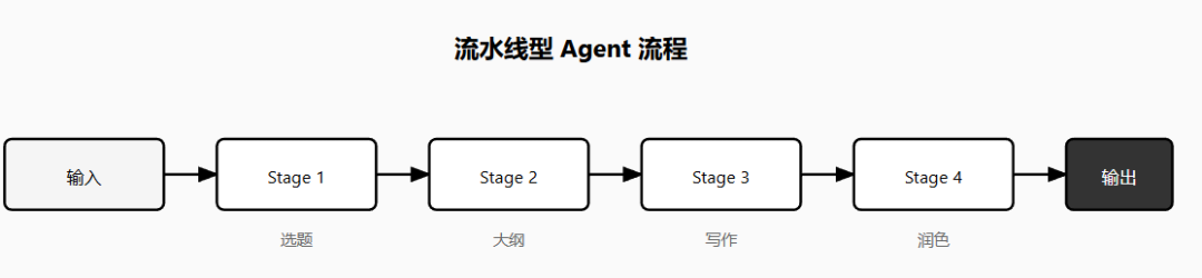 就像工厂的流水线,每个工位只做一件事,做完传给下一个工位。流水线型 Agent 也是这样,把复杂任务拆成多个标准化的环节,每个环节由专门的 Agent 处理,上一个的输出就是下一个的输入。