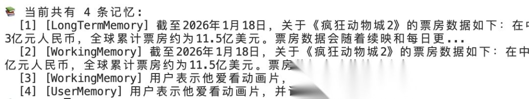 👤 [You] /memory user📚 [UserMemory] 共 5 条记忆:[1][UserMemory] 用户是一名AI应用架构师,工作繁忙,无法观看所有比赛。...[2][UserMemory] 用户在2026年1月16日下午5:22确认他将继续支持阿根廷国家队参加2026年世界杯。...[3][UserMemory] 用户在2026年1月16日下午5:22表示,他偏向技术型球员,虽然认为C罗很厉害,但更喜欢梅西。...[4][UserMemory] 用户对梅西和C罗的强弱进行了讨论,询问助手对这两位球员的看法。...[5][UserMemory] 用户喜欢足球和网球,并对这两项运动的特点表示了兴趣。...👤 [You] /memory long📚 [LongTermMemory] 共 2 条记忆:[1][LongTermMemory] 助手建议用户关注阿根廷的关键比赛或高峰时段的精彩时刻,并提到可以利用时间观看重播或精彩集锦,以保持对比赛的了解。...[2][LongTermMemory]2026年世界杯将于2026年6月8日开始,并将在美国、加拿大和墨西哥举行。...