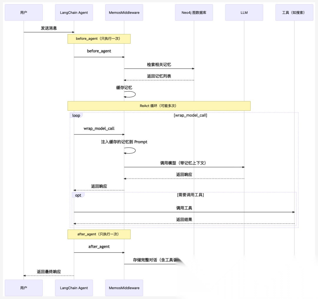 ...class MemosMiddleware(AgentMiddleware): def __init__(self, user_id: str, top_k: int = 5, auto_memorize: bool = True): self.memory_helper = MemosMemoryHelper(user_id, top_k) ..... def before_agent(self, state: AgentState, runtime: Runtime): """Agent 开始前:检索记忆(只执行一次)""" ...... def wrap_model_call(self, request: ModelRequest, handler) -> ModelResponse: """包裹模型调用:注入已检索的记忆到 Prompt""" ..... def after_agent(self, state: AgentState, runtime: Runtime): """Agent 完成后:存储对话到记忆库""" ......