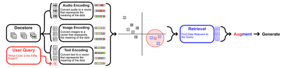 多模态RAG的一种方法是使用能够处理多种模态的嵌入_(类似于前面讨论的CLIP)_。基本上,你可以通过一组设计为相互协作的编码器传递数据,然后在所有模态中检索与用户查询最相似的数据。