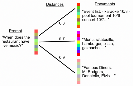 这个过程是通过一组参考文档以及用户的查询来完成的。可以计算这些向量之间的距离,文档与用户查询之间距离最小的被认为是最相关的。