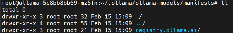 Ⅰ看ollama-models下的manifests文件夹是有文件的,若没有说明cp命令失败,会导致ollama list结果为空。可能是因为kubectl cp /tmp/ollama-models/漏了最后的“/”,导致没有完整拷贝该目录下的所有内容(包括所有子目录、文件) 到目标路径。