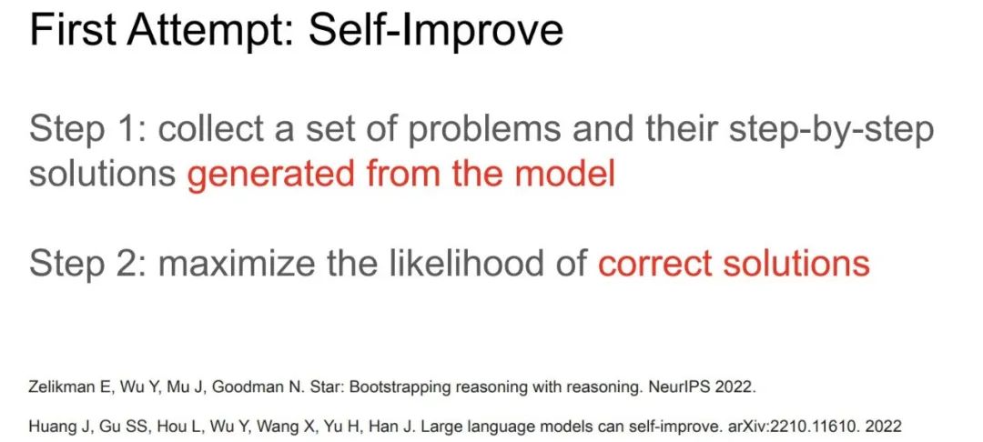 所以第一波尝试被称作自我提升,与其从人类那里生成、收集数据,我们可以直接让模型生成数据。所以收集问题的数据集,你的模型要逐步生成解决方案,然后再次最大化正确答案的可能性。