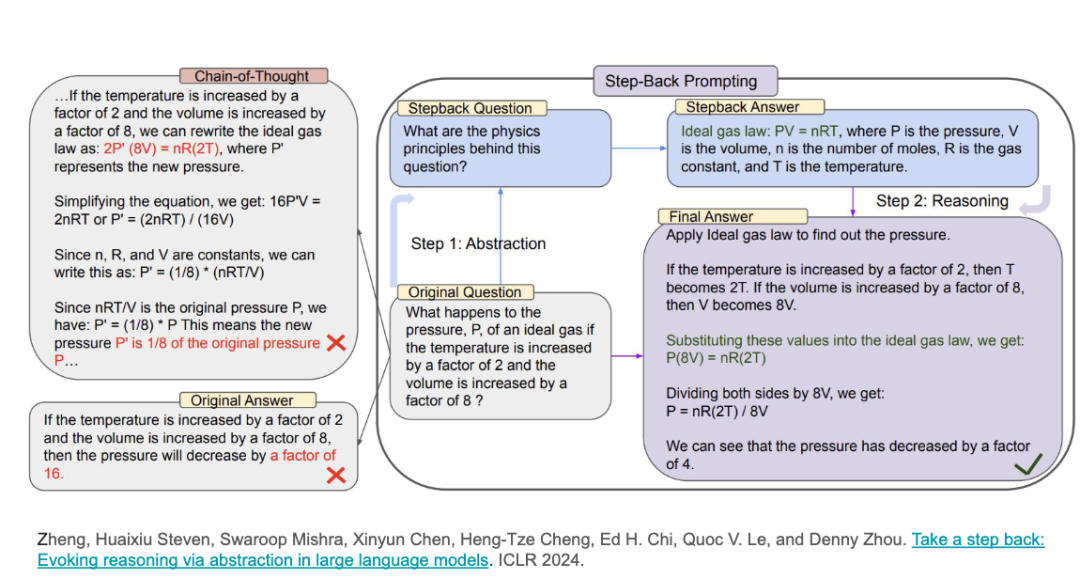 另一个例子是「后退一步」的方法。在解决问题之前,我们给模型提供了一些简短的例子,让它理解如何抽象化思考。例如,在解决实际问题之前,我们可以让模型「后退一步」,思考更抽象的原则,然后再应用到实际问题中。这就是检索在推理中的作用。