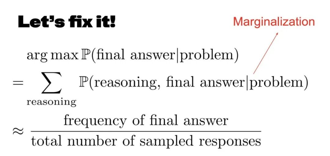 因此,通过随机抽样生成多个响应,然后选择出现频率最高的答案。我们不看推理通过率,它只选择最常见的答案,而不是最常见的任务通过率。这就是诀窍。这在实证中被称为边缘化。如果你采用这种方法,就会看到巨大的改进。