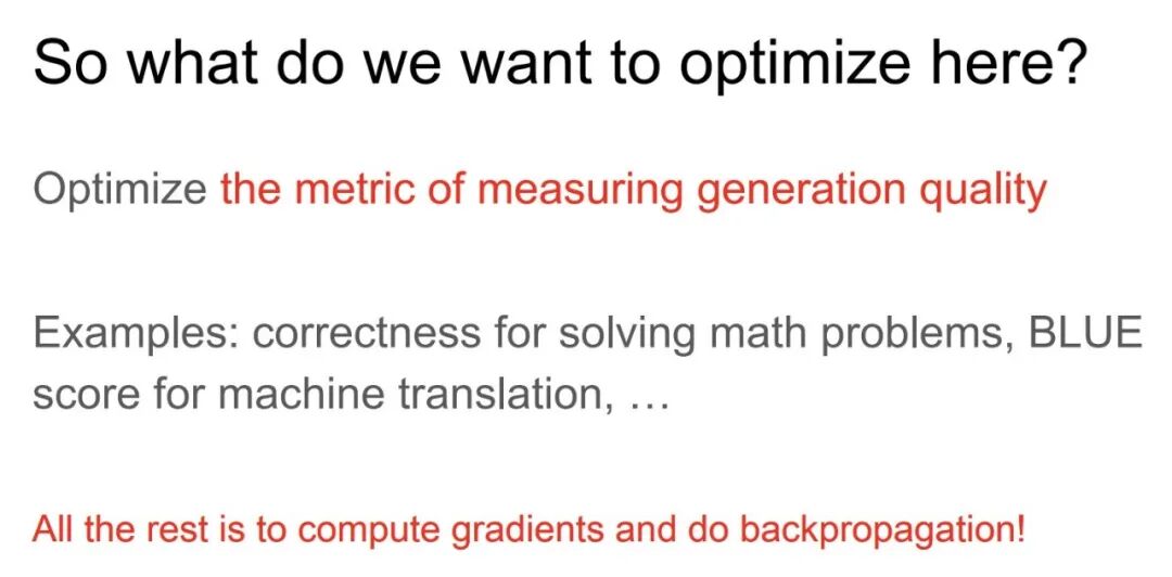 这与机器学习中的第一性原理相关,即直接优化我们想要的东西。如果我们想构建一个用于推理的模型,或者只是一般地用于生成有趣的内容,我们就需要优化衡量生成质量的指标。一旦你有了一个度量标准,我们所需要做的就是计算该度量标准的梯度并进行反向传播。