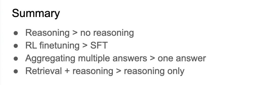 最后,Denny Zhou 进行了总结:其实大家不必再纠结 AMS 是否能够推理,至少在语言模型中,推理总是比没有推理更好,Alpha 微调比 SFT(监督微调)更好,聚合多个答案比只选一个答案更好,当然,这会更昂贵。而检索和推理的结合比单纯的推理要好得多。
