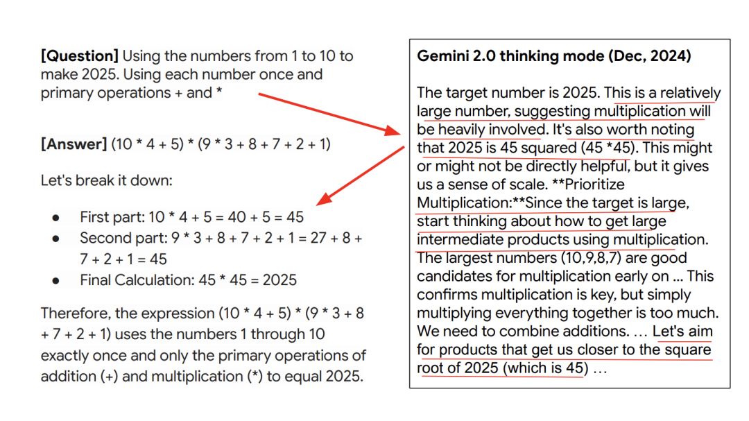 举个例子,2024 年 12 月,谷歌发布了 Gemini 2.0 思考模式,这里尝试了一个训练集里没有的问题。使用 1 到 10 的数字来组成 2025,并且明智地使用每个数字以及加法和乘法这两种基本运算。
