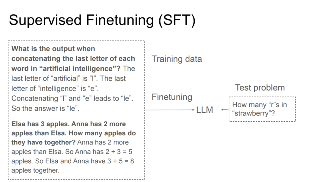 这是简单的工作原理示意:用一系列例子、问题和答案微调你的模型,然后就可以在新的问题上进行测试了。比如这里就是众多大模型难以回答的 strawberry 单词里有多少个 r 的问题。很多人一度认为这个问题是用于测试 AGI 是否出现的「重大问题」。