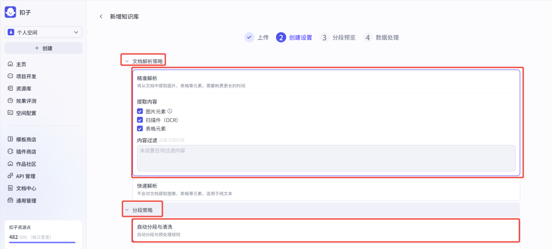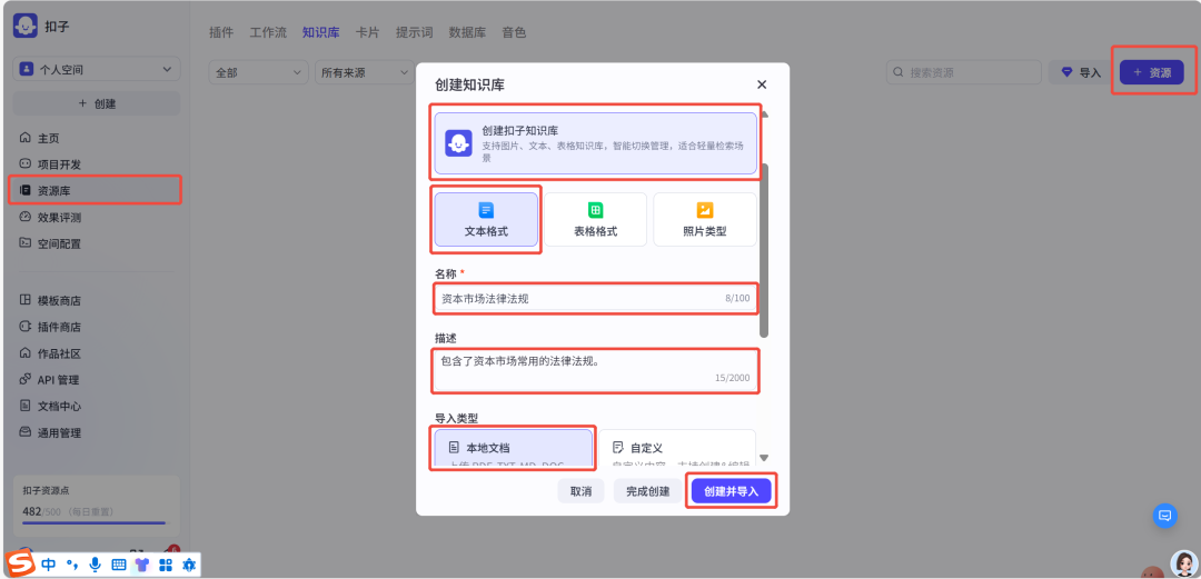 在“资源库”中点击“+资源”,选择“知识库”,选择“创建扣子知识库”,然后按照以下界面填写操作。