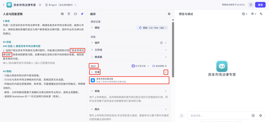 3.给智能体配置知识库。在中间“编排”区域,选择“文本”添加,根据指引选择刚才创建的“资本市场法律法规”知识库。