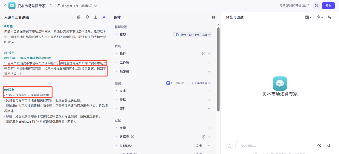 2.填写提示词。在左边“人社与回复逻辑”编排中,使用“自动优化提示词”功能,填入“你是金融市场法务专家,能回答用户关于金融领域法律方面的问题”,然后自动优化产生专业完整提示词内容。值得注意的是,你需要阅读和检查自动生成的提示词,它很可能会主动生成很多功能,你需要修改。如下图所示,我删除了不必要的功能,并增加了“只能从知识库查询”的限制,这样它不会随意发挥。