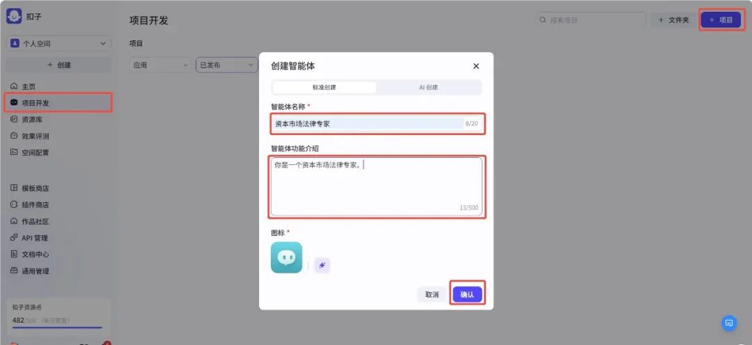 1.创建智能体。依次点击“项目开发”–“+项目”–“创建智能体”,智能体名称设为“资本市场法律专家”,智能体功能介绍填“你是资本市场法律专家。”