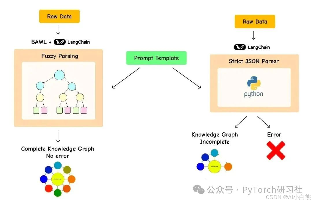 LangChain提取功能的一个关键问题是它依赖严格的JSON解析,即使使用更大的模型或非常详细的提示模板,也可能失败。相比之下,BAML使用一种模糊解析(fuzzy parsing)方法,即使LLM的输出不是完美的JSON格式,也能成功提取数据。