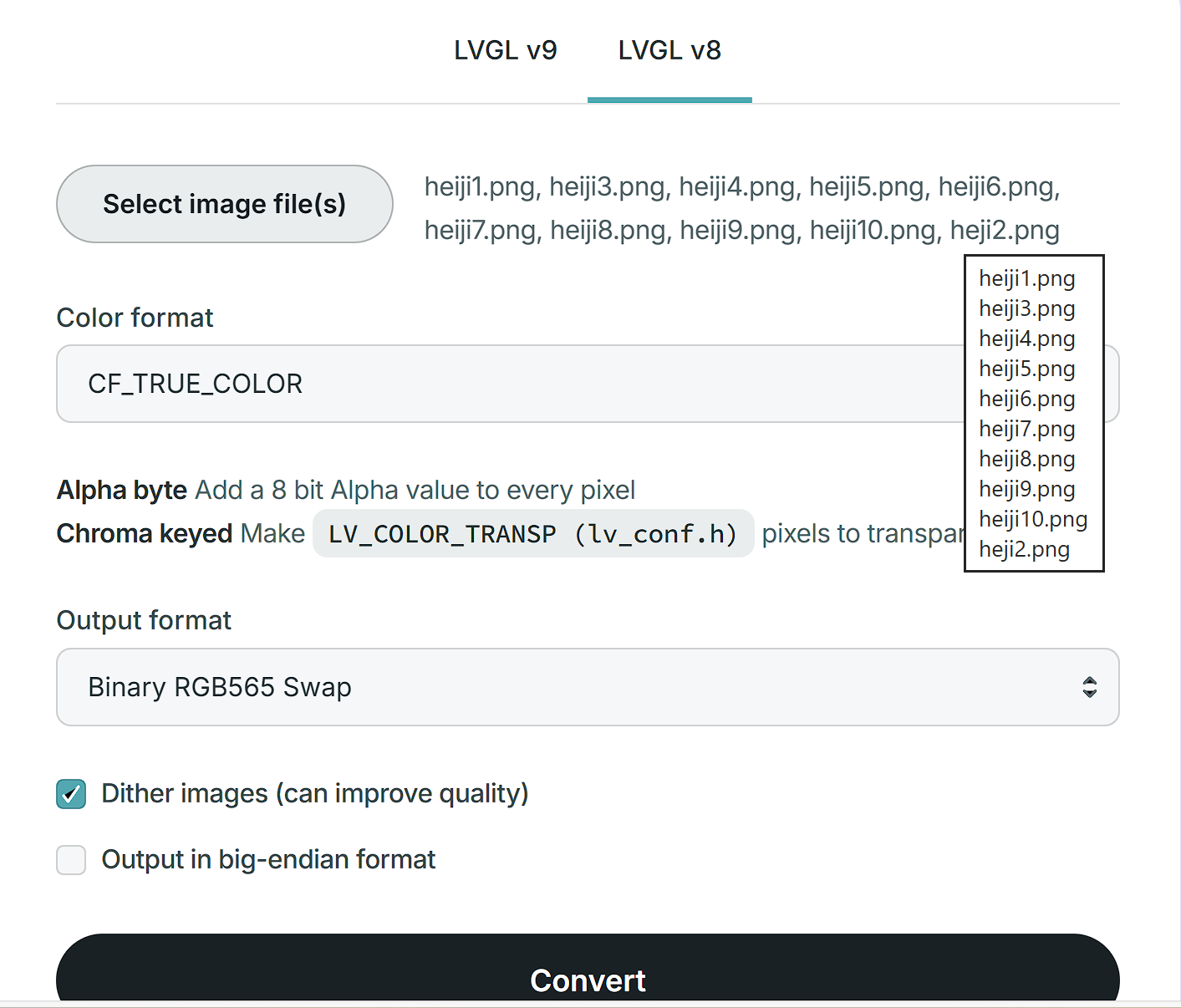 使用Image Converter — LVGL进行图片转换(我也是试了很多次才得出这个选项,其他的都是花屏)