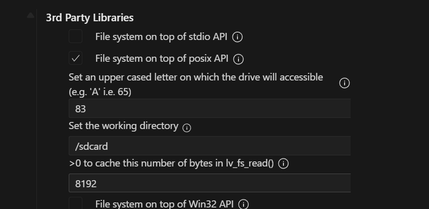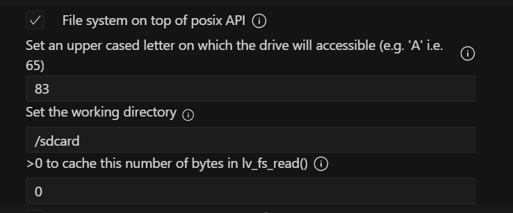 - 83 是字母 S 的 ASCII,这样在代码里才能用 "S:/xxx" 访问 SD 卡(例如 lv_img_set_src(img, "S:/img.bin"))【这里的s是盘符】