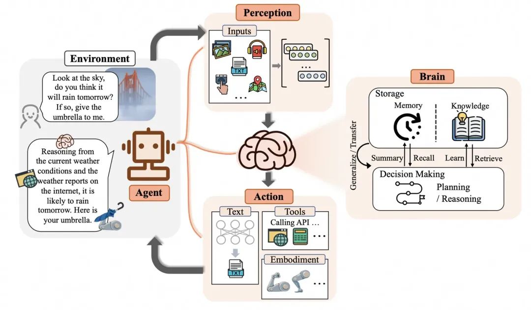 另外的一个定义是复旦大学NLP团队给出来的,他们认为Agent的概念框架包括三个组件:大脑、感知、行动[2]。大脑模块作为控制器,承担记忆、思考和决策等基本任务。感知模块从外部环境感知并处理多模态信息,而行动模块则使用工具执行任务并影响周围环境。比如:当人类询问是否会下雨时,感知模块将指令转换为大模型可以理解的表示,然后,大脑会根据当前天气和互联网天气报告开始推理,最后,行动模块作出回应并将雨伞递给人类。通过重复上述过程,Agent可以不断获得反馈并与环境互动。