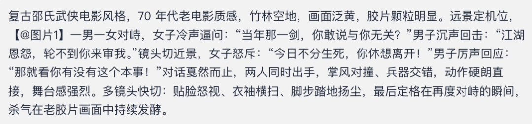 先来点开胃菜,最近网上邵氏武侠AI视频火得不行,于是我直接输入一张武林中人对打的动作写真照: