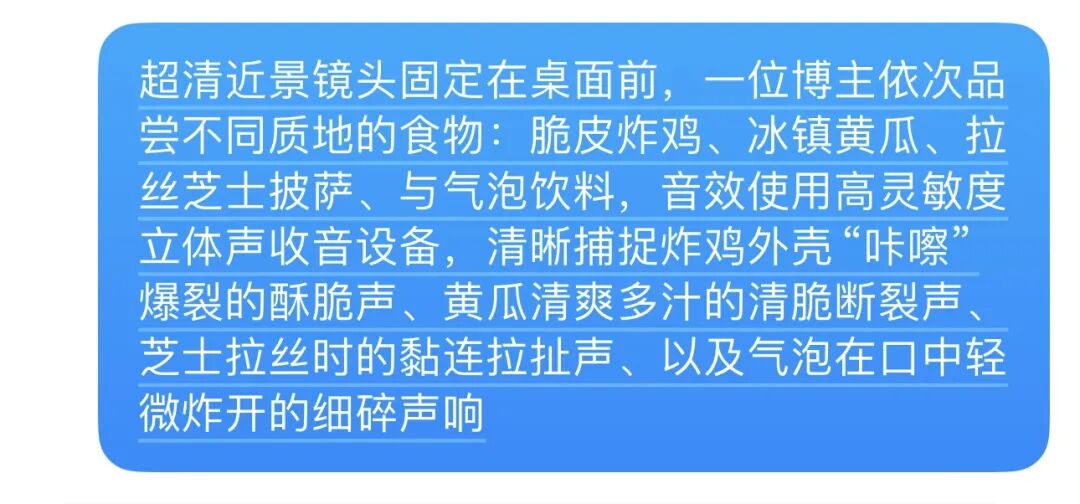 我们先来试一个非常考验音效能力的场景——吃播(流哈喇子,看看模型能不能准确还原不同食物咀嚼的声音: