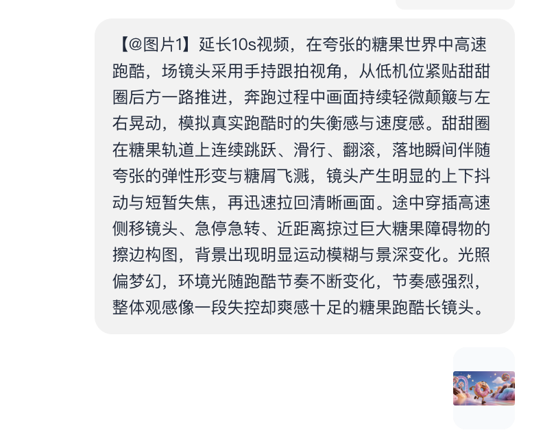 这次我给AI喂的是一张3D风格、正在奔跑的甜甜圈图片,要求它延长生成一段10秒的视频,并在过程中完成翻滚、跳跃、滑行等一整套连续动作: