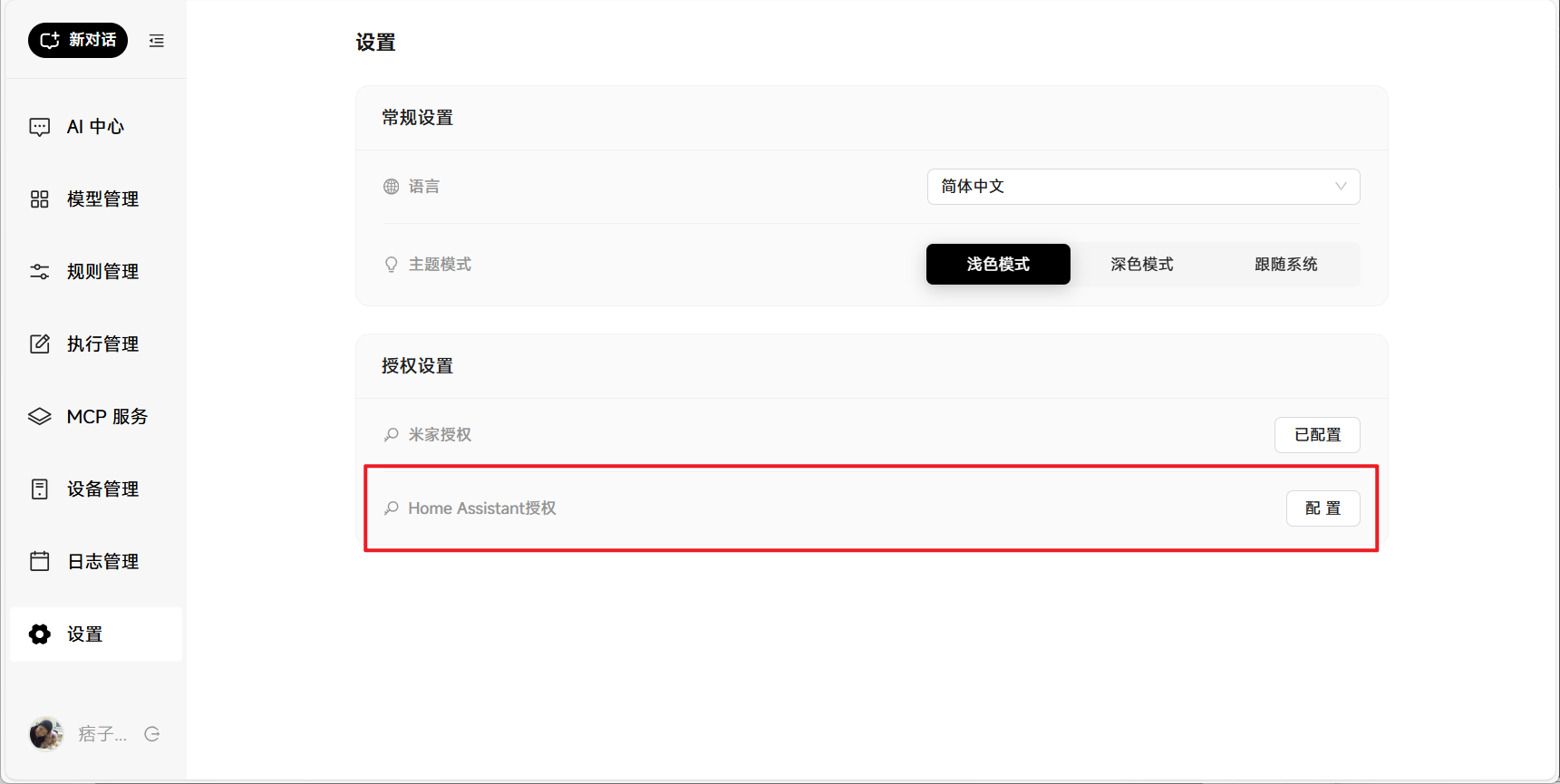 🔺在“设置”中还可以通过Home Assistant 授权加入更多智能家居设备,我这里没有配置Home Assistant ,就不往下演示了~