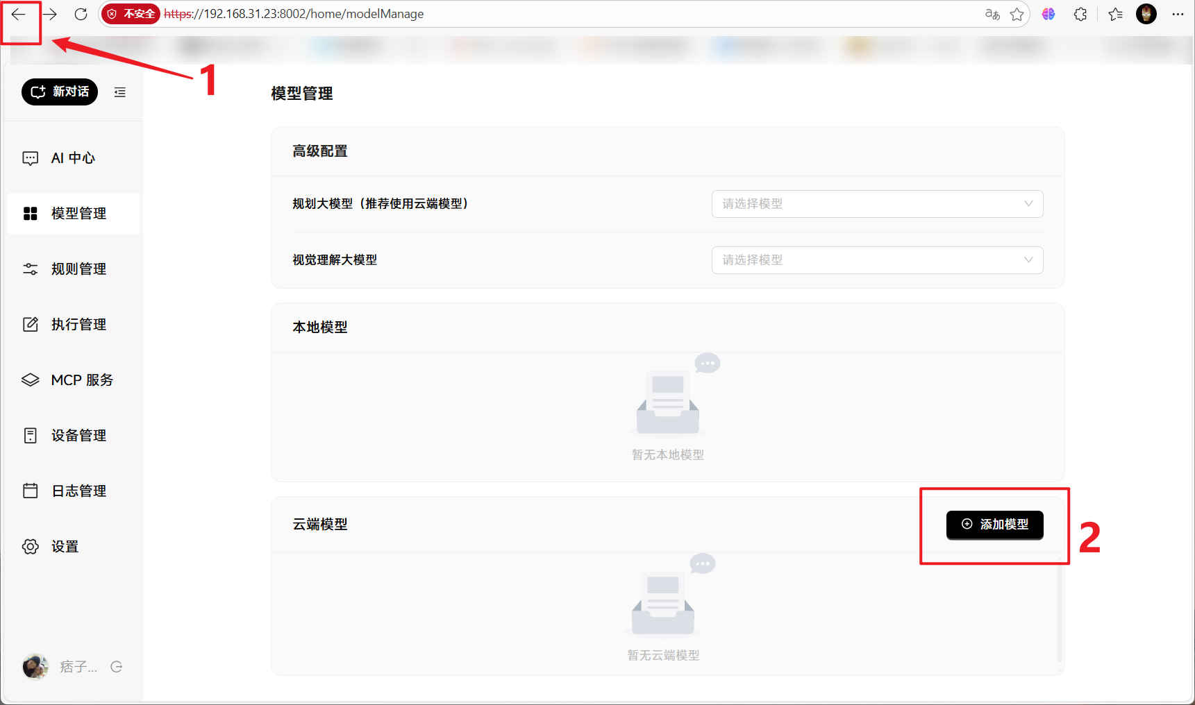 🔺接下来的操作就是将大模型加入进来,点击“模型管理”。