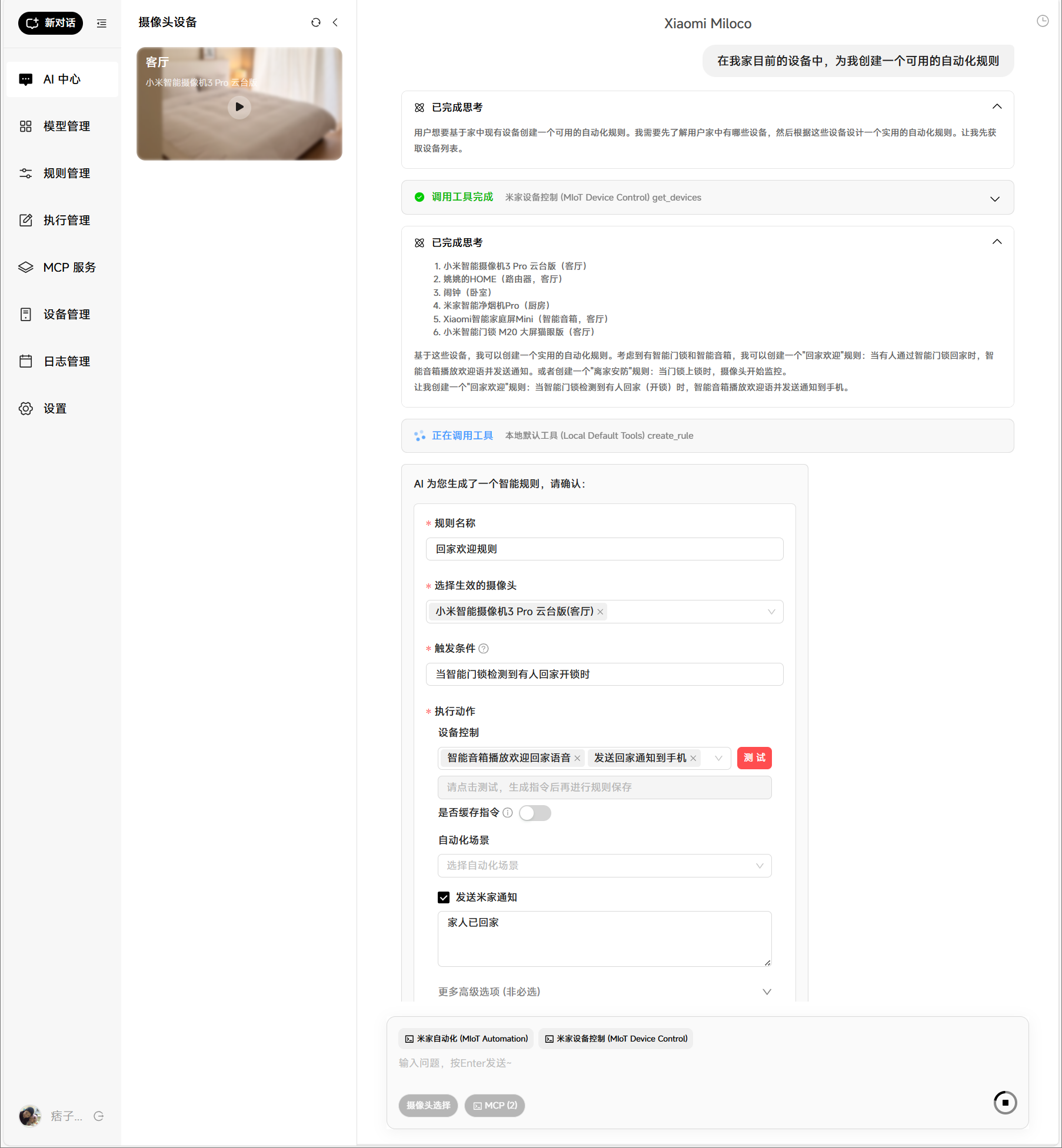 米家生态:打通米家生态,支持米家设备、米家场景的获取与执行,支持自定义内容发送米家通知。