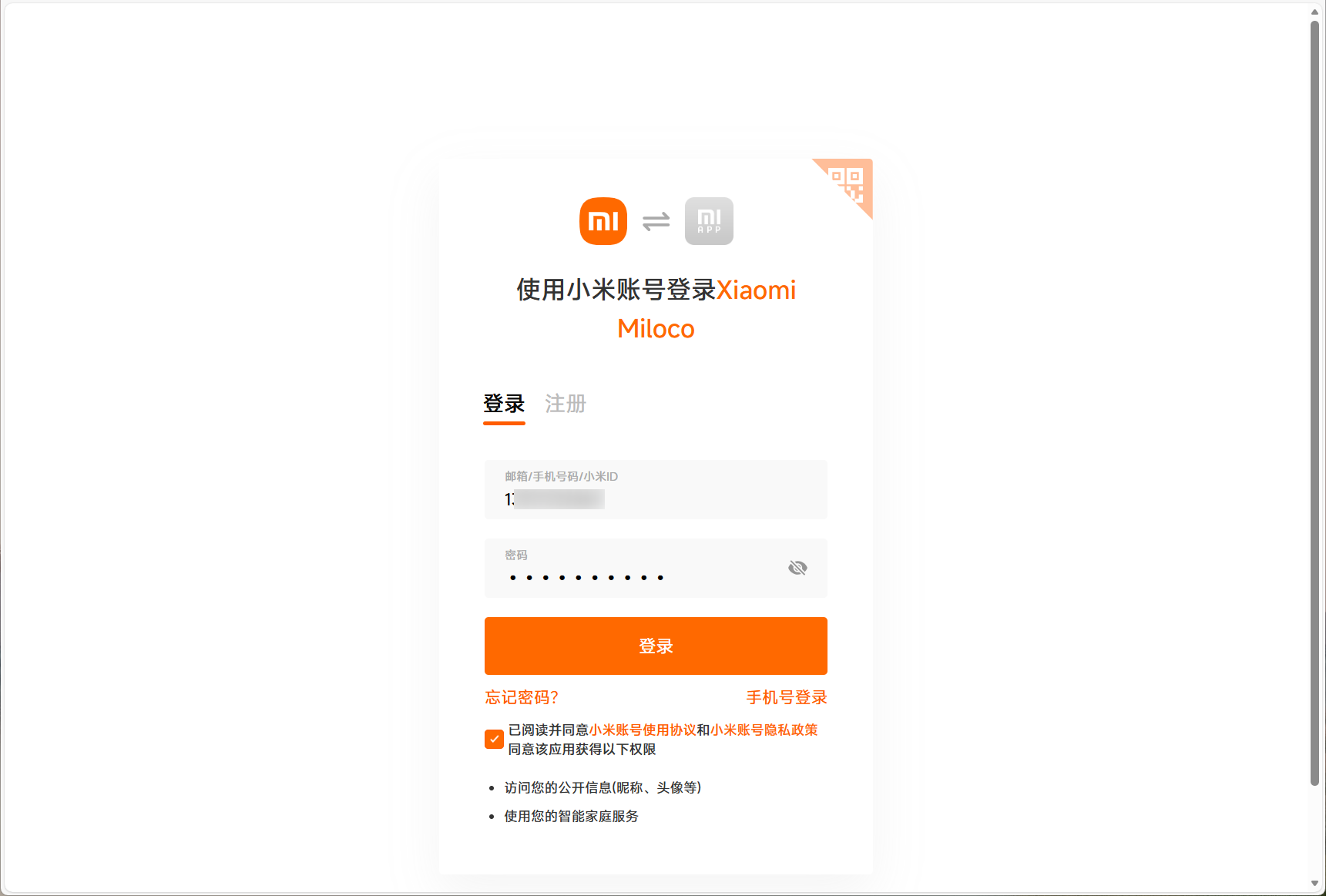 🔺之后会让我们登录自己的小米账号授权,可以直接输入账号和密码,也可以通过APP扫码的方式。这里大家直接登录即可,毕竟是官方项目,安全性还是没什么问题的。