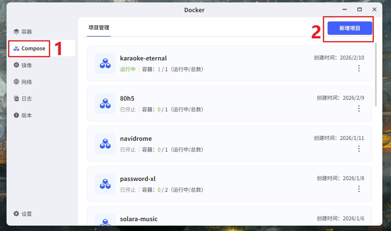 🔺然后点击极空间NAS的“Docker”应用,点击【Compose】 > 【新增项目】。