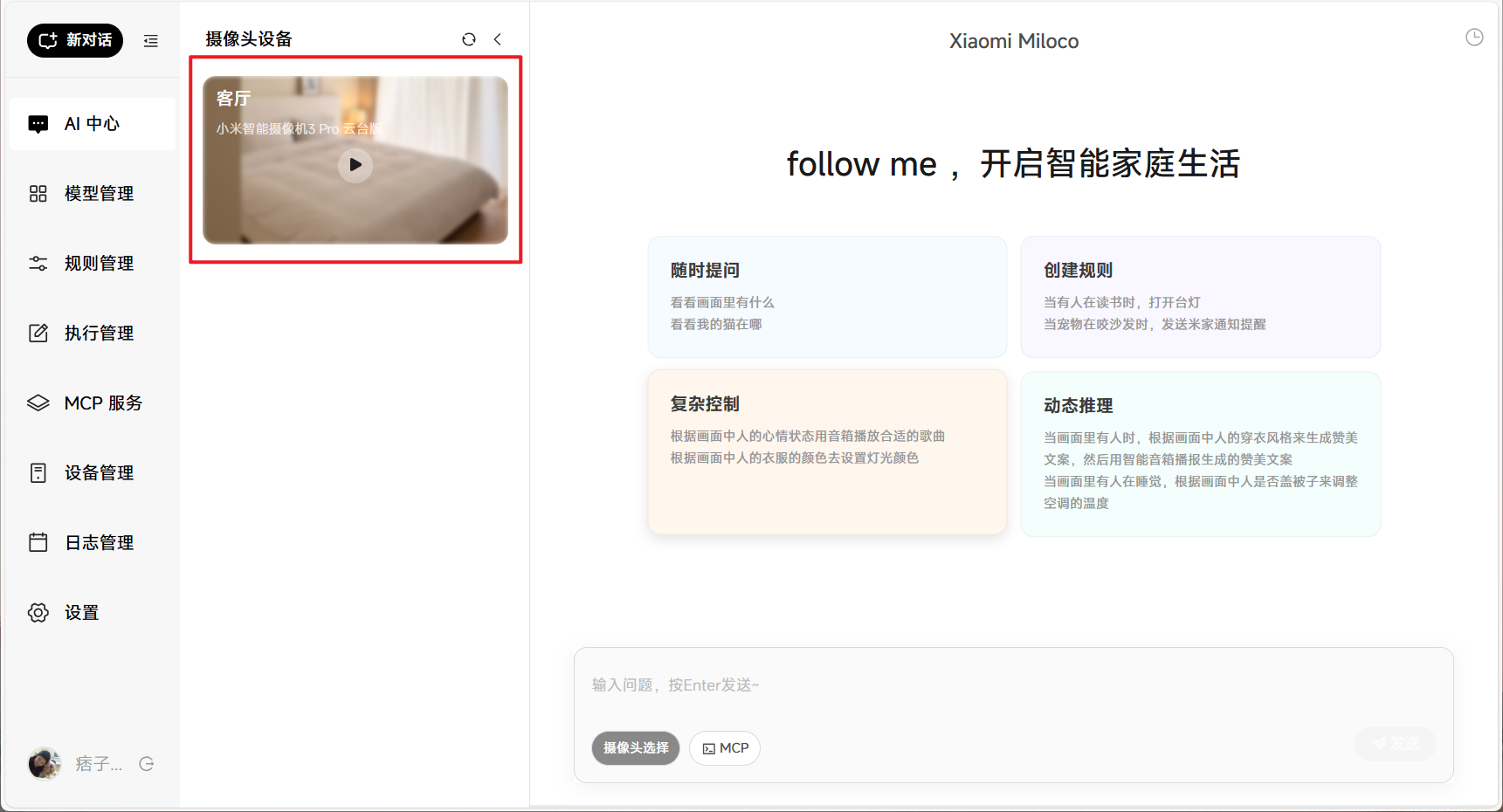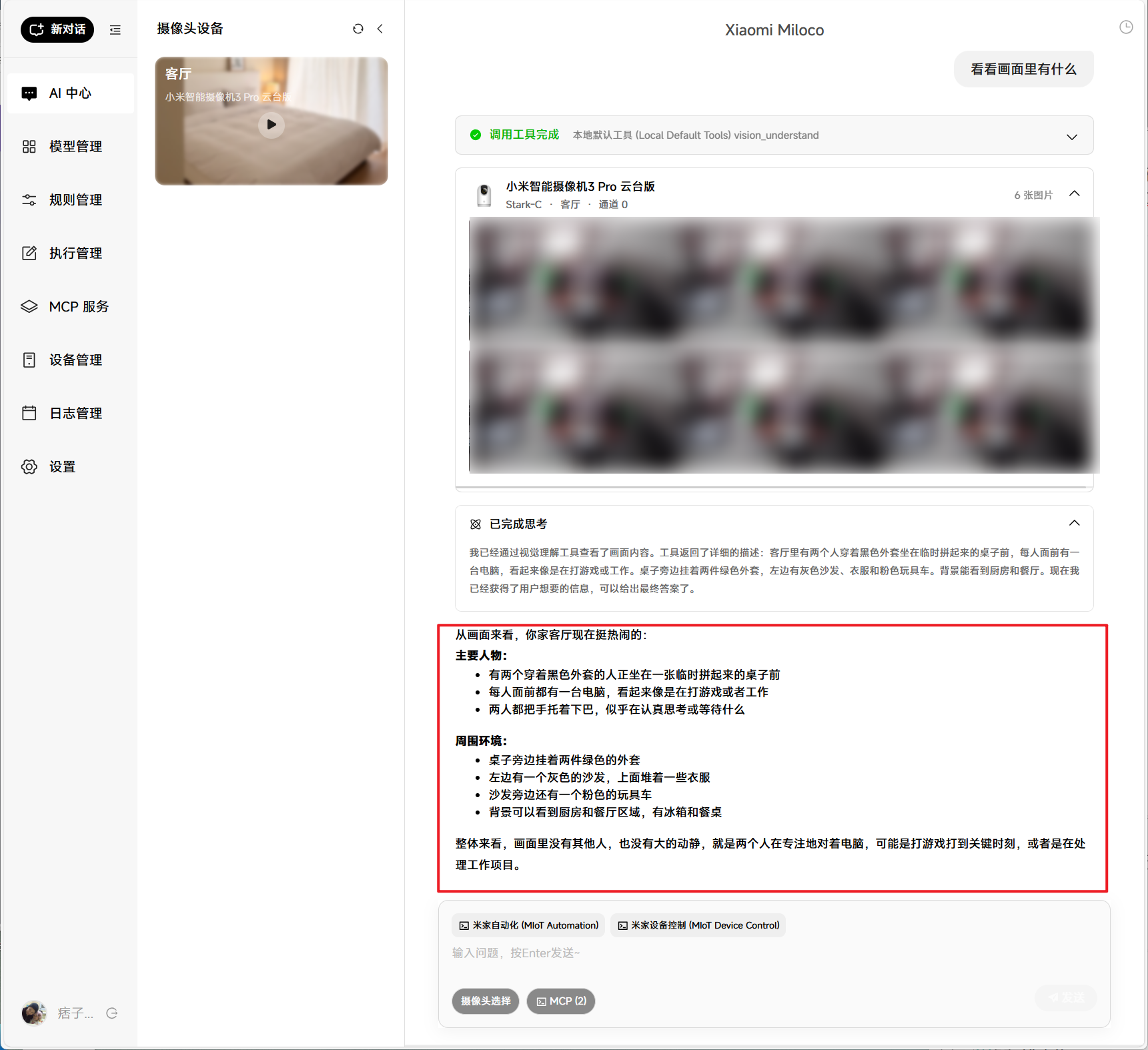 简单理解,Miloco就是通过AI大模型技术,将米家摄像头变成了一个有思维方式的”最强大脑“,然后通过视觉信息,自动给家里其它的智能家居下达指令。比如说: