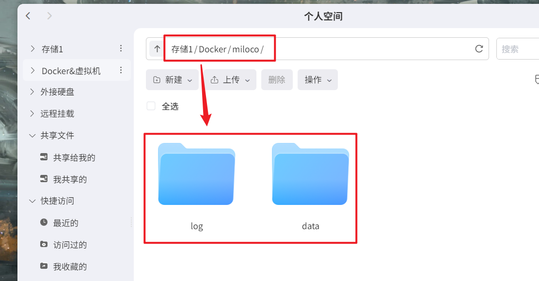 🔺打开极空间NAS的文件管理器,在Docker目录下新建一个“miloco”的文件夹,然后在它下面新建data、log两个子文件夹。