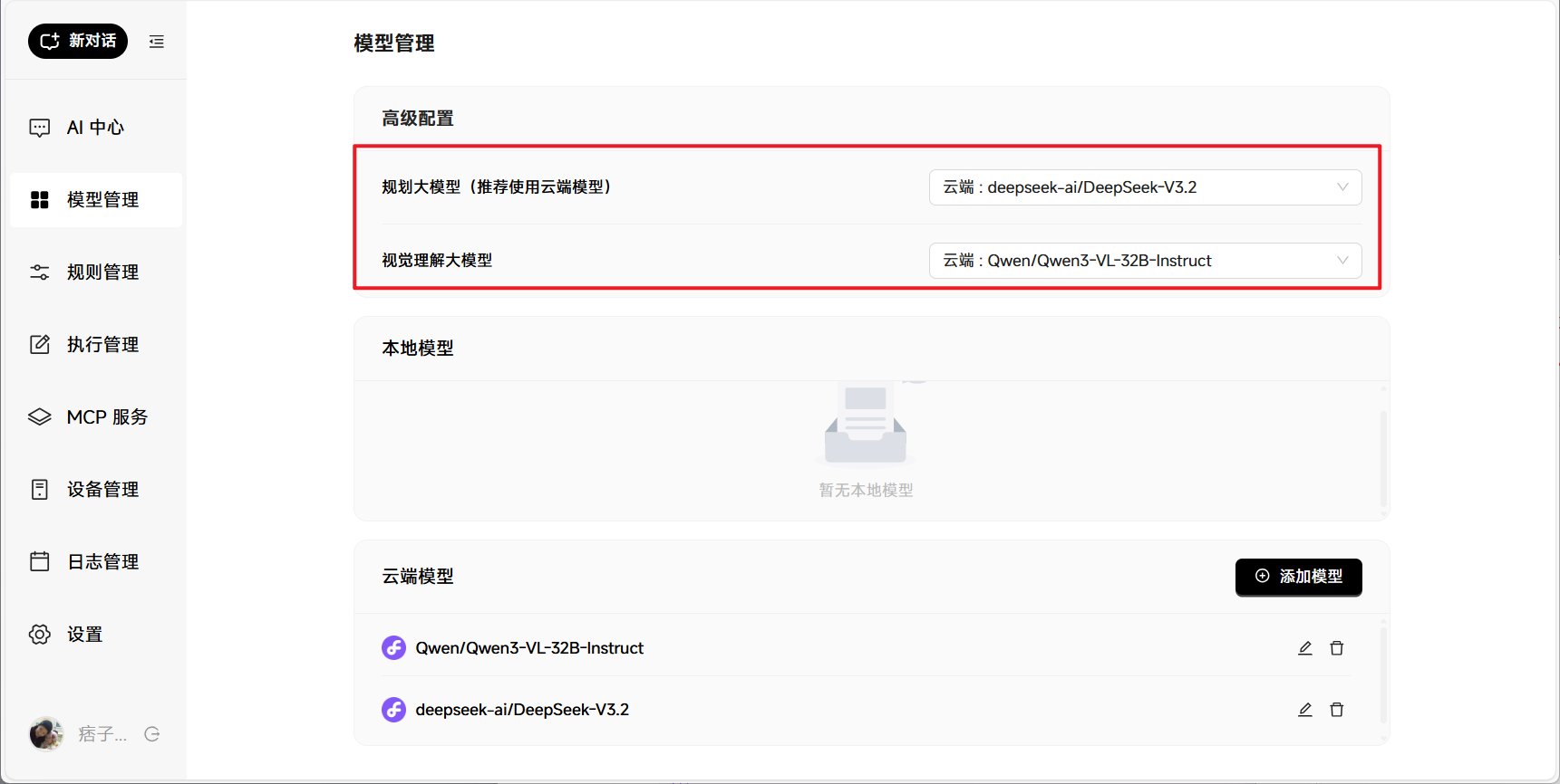 🔺添加好之后再“高级配置”这里,规划大模型选择“deepseek-ai/DeepSeek-V3.2”,视觉理解选择“Qwen/Qwen3-VL-32B-Instruct”,然后就可以使用了。