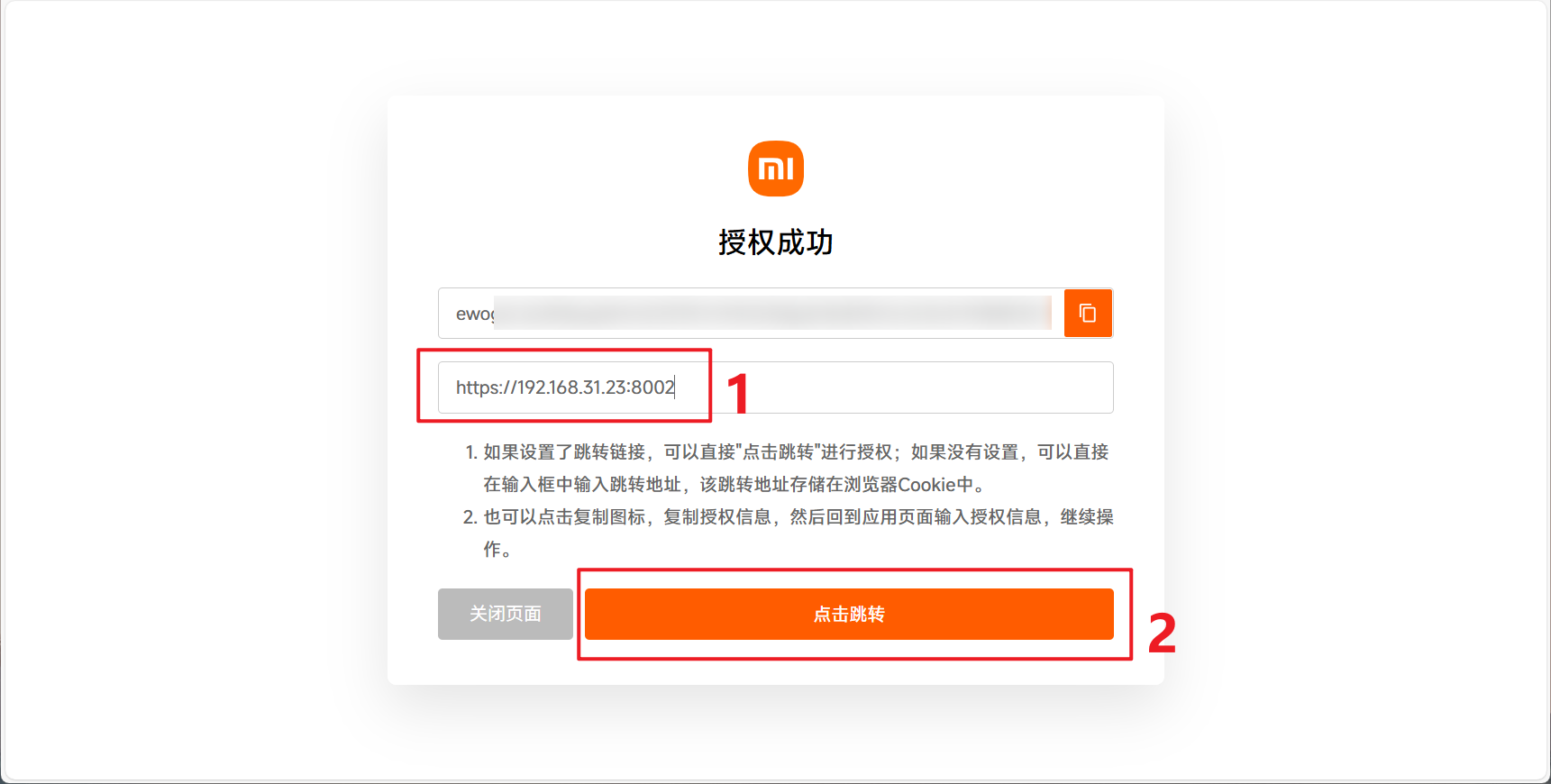 🔺授权成功之后会有提示,这里需要输入我们部署好的Miloco服务链接(其实就是“https://NAS IP:端口号),然后”点击跳转“。