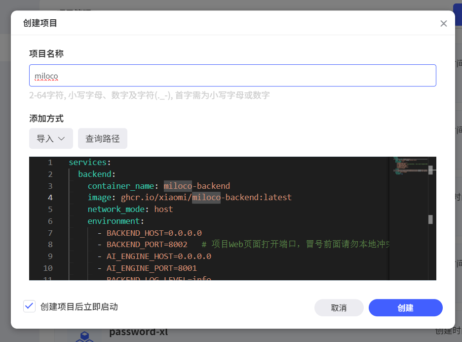 🔺在新增项目页面自定义项目名称,输入以下 Docker Compose 配置信息后点“创建”按钮: